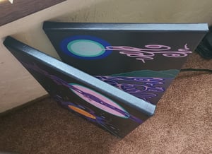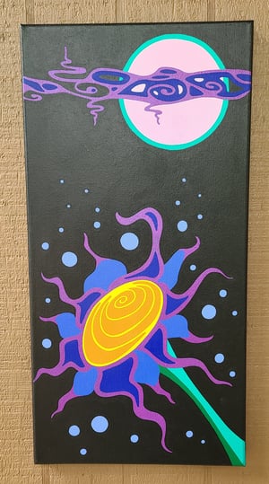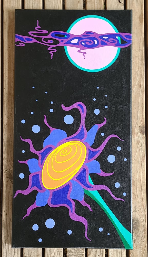 Acrylic Painting done in Golden and Liquitex brands of professional acrylic paints done on a black canvas. Love Nature and the Moon so did this psychedelic flower. It is done on a shallow canvas about 1/2 in deep and the measurements are 10in by 20in or about 26cm by 51cm. Domestic Priority Shipping included in Price.