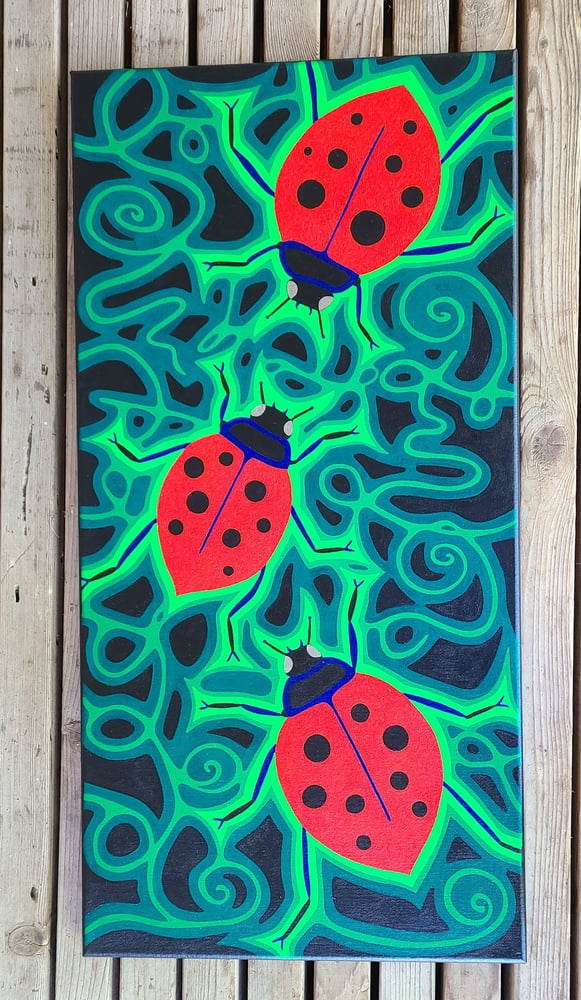 Acrylic Painting done with Golden and Liquitex brand professional paints on black canvas. Anyone who has a garden probably should like this one! This one was a lot of work! It was fun to do because was pleased how it turned out. Love nature and insects so that is what inspired this one. It is done on a shallow canvas that is about 1/2 inch deep and the dimensions are 12in by 24in or about 30cm by 61cm. Enjoy! I know I did!! Domestic Priority shipping included in Price.