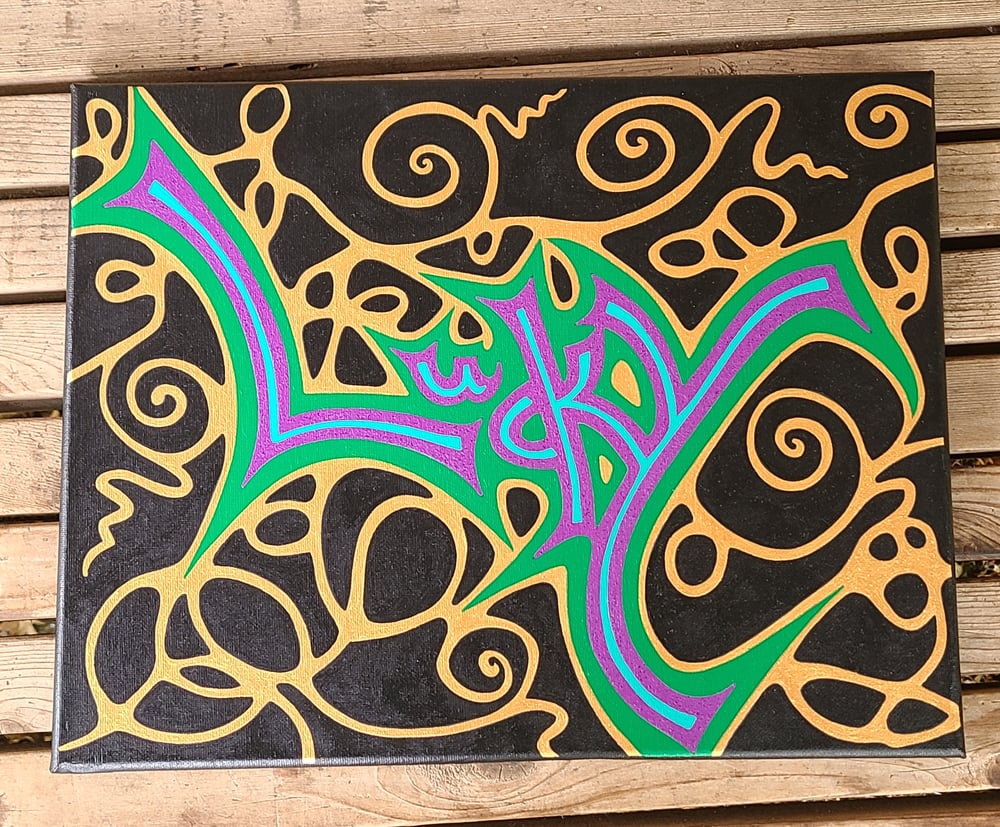 Acrylic Painting of the word 'Lucky' done in Golden and Liquitex brands of professional acrylic paint. Definitely was feeling Lucky when I did this! Did think about my Irish heritage when I did it as well. It is done on a shallow black canvas that is just over 1/2 inch and measures 14in by 11in or 36cm by 28cm. This was a fun one to make. Domestic Priority Shipping included in Price.