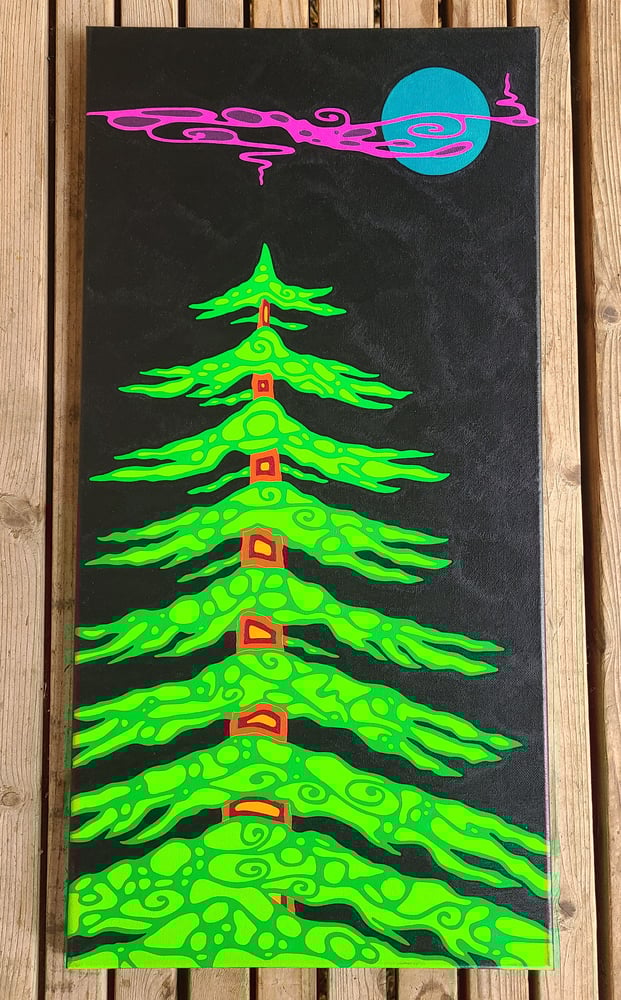 Acrylic Painting done with Golden and Liquitex brand professional acrylic paints. Love trees a bunch and did a series of them, on black canvas, a while ago mostly all done while I've been living in OR. This is the largest of the most recent ones I have done. Anyway, of course it was a joy to make. It is done on a shallow canvas (about 1/2 of an inch) and the dimensions are 12in by 24in or about 30cm by 61cm. Enjoy! Domestic Priority Shipping included in Price.