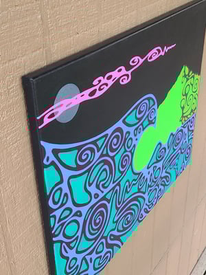 When I lived in Mendocino, I did a number of Wave and Tree paintings. The dimension of this original Acrylic Painting is 16 inches by 20 inches with 1/2 inch sides. This is one of that series. I used some dark contrasting colors to do this one. It was a joy to make. In the past and even now there is a cool art scene in that community, like a lot of coastal communities. I love the ocean and waves and did visit the beach often when I lived out there. I really Loved doing Wave paintings. It gave me a chance to play with some abstraction within that form. I don't think I will be doing as many Wave paintings since I no longer live on the coast. I am thinking of doing more Tree paintings in future if I get some time to paint because I am out here in OR where there are a lot of Trees. Domestic Priority Shipping included in Price.